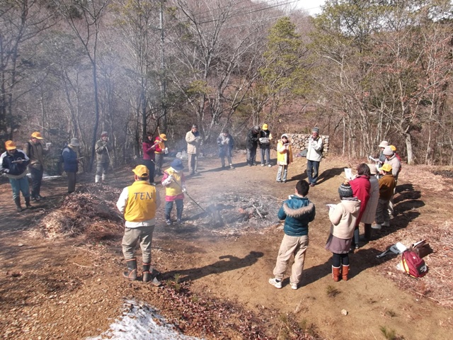 アルミホイルにさつまいも、じゃがいもを包み、焚火の灰の中にいれ、焼き上がるまで30分待ちました。その間みんなで唱歌をうたいました。(たきび・スキー・春よ来い!等(%音符1%)(%音符2%))