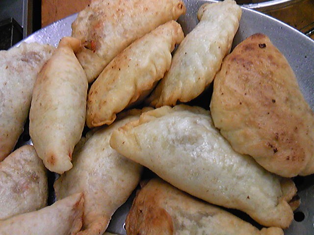 小麦粉で作った手作りの皮で、豚のひき肉、エリンギ、春さめ、人参をクミンなどでいためたものを包み、これも油で揚げます。