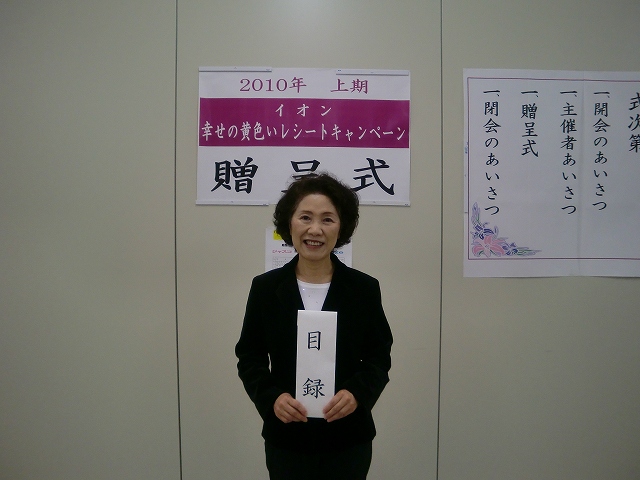 贈呈式初参加のKAZUKO理事です。店長さんから直々に目録をいただいて、ドキドキ…(%ニコ女%)