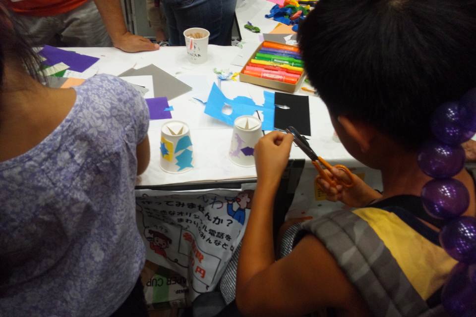 兄弟や親子で一緒につくったり、つくった電話をつかって話をしたり。3日間で約750名の子どもたちが作成に参加しました。