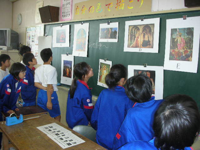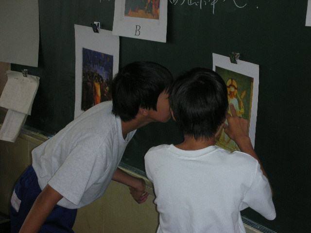 1学年必修授業「ルネサンス2007」の最終課題である「僕の私のルネサンス的出来事」に、今日から入りました。まずは第一時間目。自分の一生を振り返り、ルネサンス的出来事を絵にしようという課題です。一生の中の一場面を絵にするというイメージがつかめないと思うので、西欧絵画の代表であるイエスキリストの一生の8枚の絵を、思い思いの場面に仕立て上げ、お話にしてみました。生徒は食い入るように鑑賞しています。見ているうちに、いろいろな見方をしているようです。
