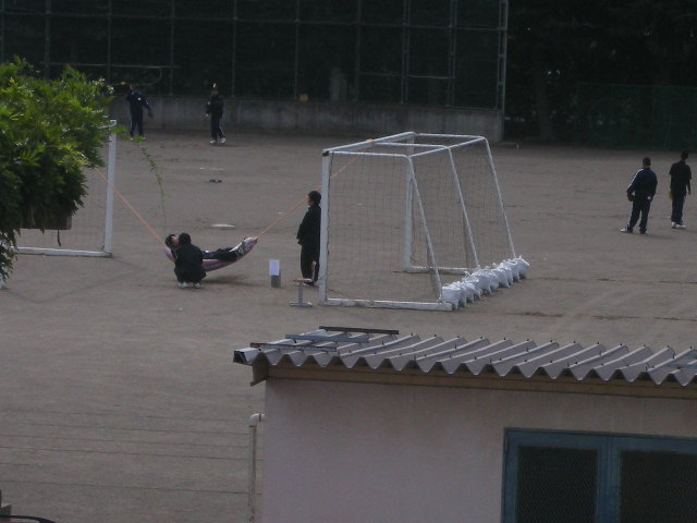 校舎内にハンモックがつるされています。布団で作りました。ハンモックに寝っ転がり、空を見てみませんか?