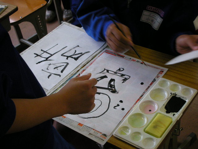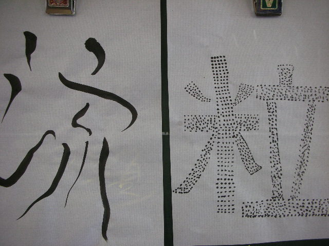 「ズバリ撮るわよ!」で、テーマを表現することに興味を持った生徒たちは、発想豊かに習字紙に感字練習をします。いきなり写真のような秀作が生まれました。