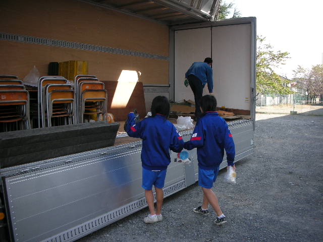 朝9時30分。トラック到着。予想以上に大きなトラックでびっくり。展示を演出する机と椅子15セットなど、作品も積み込む。