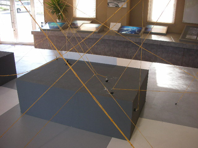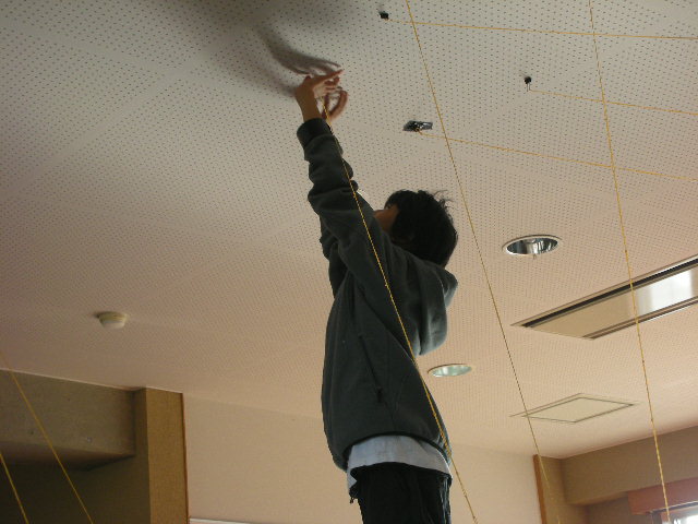 男子チームは2名。夏に千曲川ハイウェイミュージアムを訪れ、佐藤比南子さんのインスタレーションに一発で触発され、天井と床面を輪ゴムでつなぐ作品を制作。