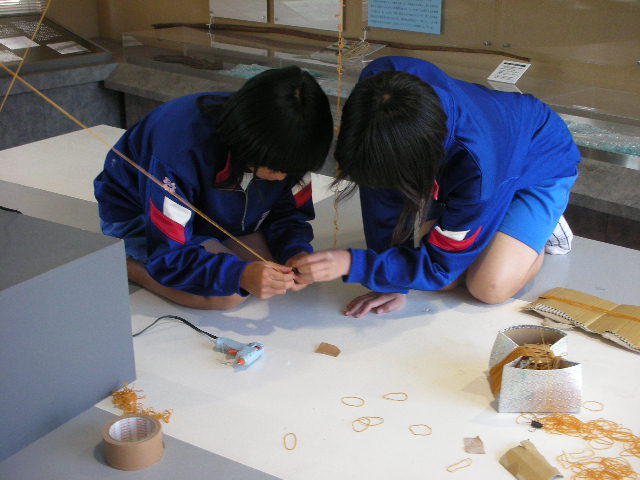 女子チーム3名。たまたま部活がお休みで参加してくれました。自分達の作品設営が終了し、男子の輪ゴムアートを協力中。