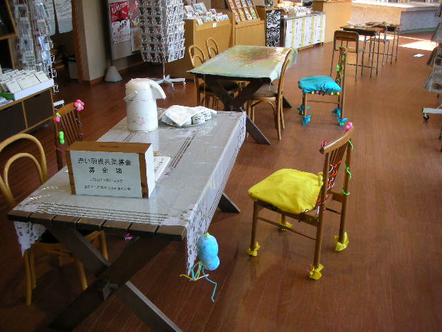 感触を楽しむ作品と聞くと、「手」で触る印象を持ちます。生徒はイスを使って「お尻の感触で楽しむ作品」を発案しました。それが「不思議なイス」。3個のイスは、ピンク、イエロー、ブルーの明るい色の布で覆われ、いかにも誰かに座ってほしいという表情をしています。一つずつ使われている素材が違っていて、座った感触も違います。感触を楽しんでもいいし、中身が何なのか考えても面白い作品です。お客さんからの評価も高い作品です。