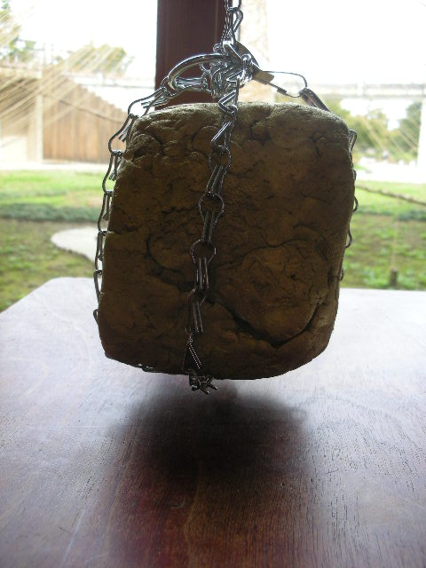 鎖で縛られた四角いオブジェ。鍵がつけられ、どこか窮屈そうな作品です。「鍵がどこに隠されています。探してください」というコメント。実際にオブジェに触って、箱を解き放つ鍵を探してみてください!