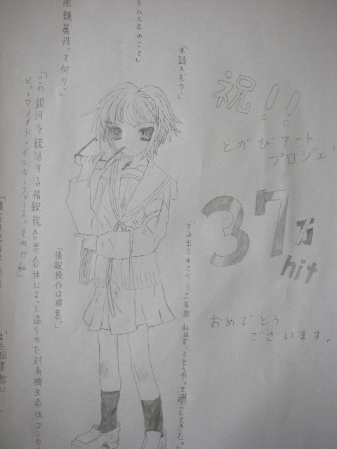 あっという間にブログアクセスも37万件を突破しました。今日、さくらびキッズが一人私のところへ来て、写真のようなイラストを置いていきました。イラストには、「とがびアートプロジェクト37万件hit。おめでとうございます」と描かれていました。このイラストを描くのに、なんと3時間!!かかったそうです。テスト前なのに、ありがとうございました。