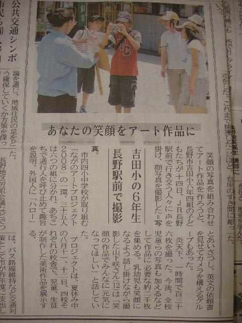 Nプロジェクト実行委員会事務局の中平です。今朝の信濃毎日新聞に長野市立吉田小学校の活動が紹介されていました。炎天下、カメラを持った小学生が長野駅で笑顔で写真を撮っている・・。そんな姿が想像されてとてもうれしかったです。