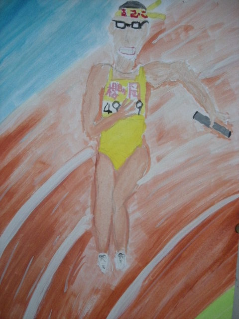写真の作品の題名は「リレー」。陸上部の生徒がバトンを渡され、必死になってコーナーを駆け抜けている一瞬が描かれています。どきどき感が伝わってきます。