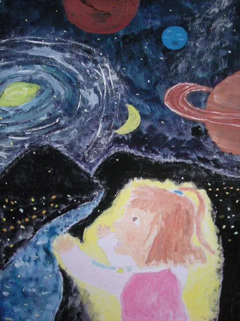 瞬間や場面ではなく、ずっと好きだったものや事も、想像力たっぷりに描かれています。写真の作品名は「宇宙と交信中」です。小さい頃から宇宙の星を見ることが大好きだった作者。宇宙の星がこんなにもリアルではっきり見えていたというイメージが表現されています。