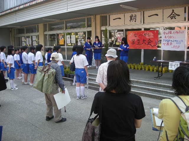 櫻ヶ岡中学校の中平です。午前9時。いよいよ写生大会開会式です。今回は美術部主催ということで、すべて美術部で開会式を行いました。部長や実行委員長も20人以上集まった一般の方がたを前に、少々緊張気味です。