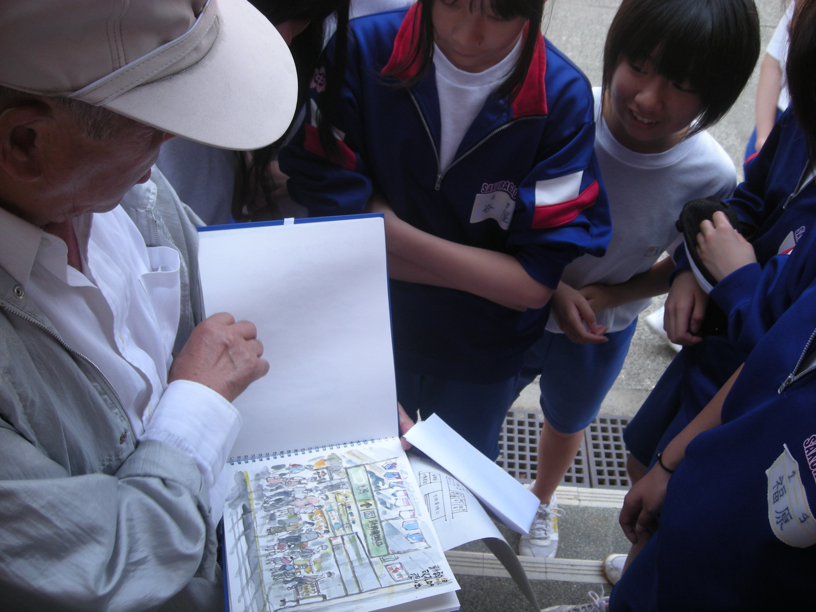 中学生に見せるために、スケッチブックなどを持ってきてくださいました。中の絵を見ると、中学生は「おーーー、うまいですねえ!!」と、目を丸くしていました。
