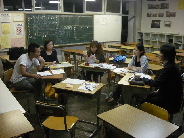 外も真っ暗になり、教室に全員集合して打ち合わせをしました。私がなぜ、このような活動をしているのかを説明しました。「美術が3年間で115時間しかなく、将来美術に授業がなくなってしまうということ」などを率直に話させていただいたところ、みなさん、大変共感してくださり、話し合いが一気に深まりました。中学生を生かし、多くの観客に来場していただけるよう、様々なアイデアが出されました。学校の美術教育を大切にしてくださっているなあと感動しました。