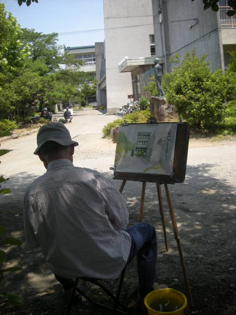櫻ヶ岡中学校の中平です。なつかし写生大会には、多くの方々がそれぞれの思いを持って参加してくださいました。水彩画協会の方々は、場所とりもすばやく、的確でした。作品は当然ですが、色が美しく、その画面の大きさを感じさせてくださいます。初めてこの学校にこられた方がほとんどのはずですが、櫻中らしい雰囲気を出しながら描かれており、感動しました。