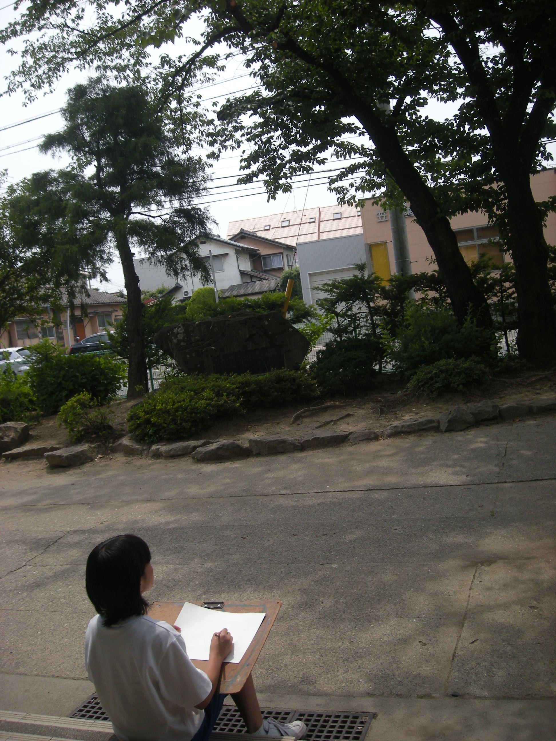 いろいろな人が参加してくれました。写真は、部活動で来た合唱部の生徒。昇降口で人を待っていましたが、「ひまなので、描いていいですか?」と写生を始めました。「完成させて、また持っていきます!」とのこと。気軽に参加できるのが、写生大会のいいところですね。