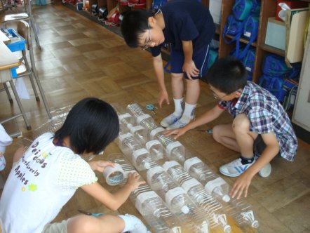全校のみなさんにも協力してもらって,2Lのペットボトルをたくさん集めて制作中です。きっとこれから色を塗るのでしょうか?今のままでも透明感があって,涼しげですね。