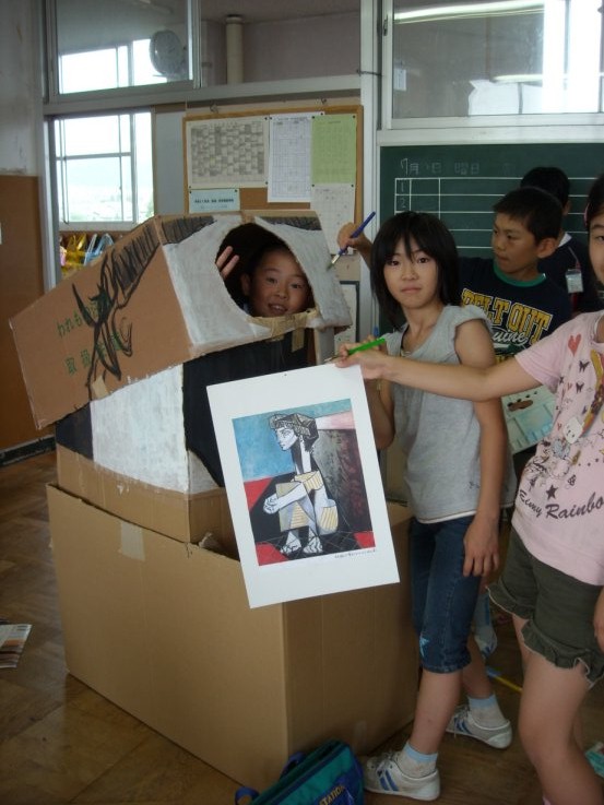 なんと,今年はみんなが知っている名画がたくさん集まりました。写真は,ピカソの「手を組んで座るジャクリーヌ」。なんとなく,わかりますか?本当に小学生の発想はおもしろいですね!