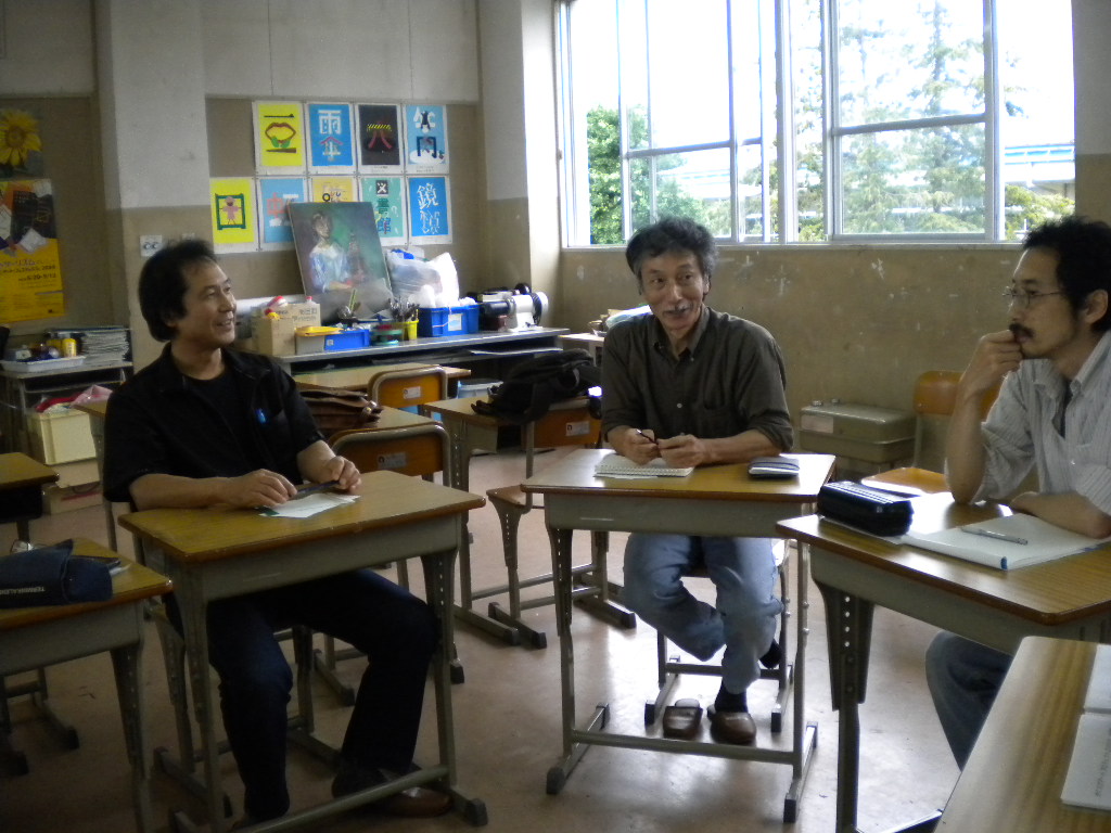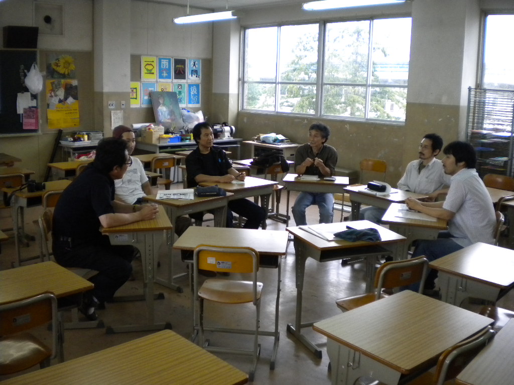 櫻ヶ岡中学校の中平です。今日の100分間授業の後、美術室で5名の作家さんと、教頭、教務、研究主任と私で、美術の授業について円卓会議兼研究会を行いました。はじめは15分くらいで終わるかと思っていましたが、かなり話の内容が面白く、結局一時間話し合いを行いました。