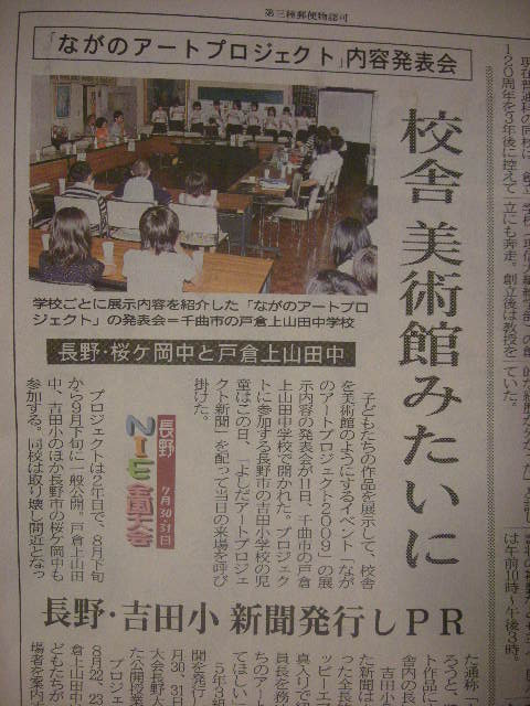 長野市立吉田小学校は、7月31日に同校で行われるNIE全国大会の授業学級。新聞活用教育の一環として、児童がながのアートプロジェクトを広げる手段に新聞を使います。是非、授業も見てみたいですね。
