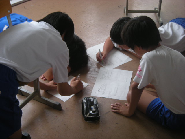 櫻ヶ岡中学校の中平です。2年必修授業「ズバリ言うわよ!」の中の小題材「ズバリ撮るわよ」。テーマをくじ引きして、グループで写真一枚にパフォーマンスします。グループが決まり、話し合いをしています。あるグループは瞬間的に発想が広がり、どんなアクションをして、どんな写真にしたいか決まってしまったようです。