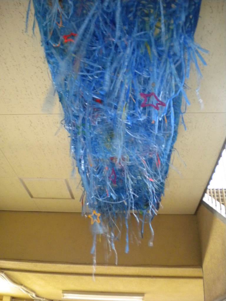 戸倉上山田中学校の中平です。3年選択美術「でているよ」続々完成です。天井から涼しげな空間が出現。この猛暑の中、上をみあげると、気持ちが癒されます。
