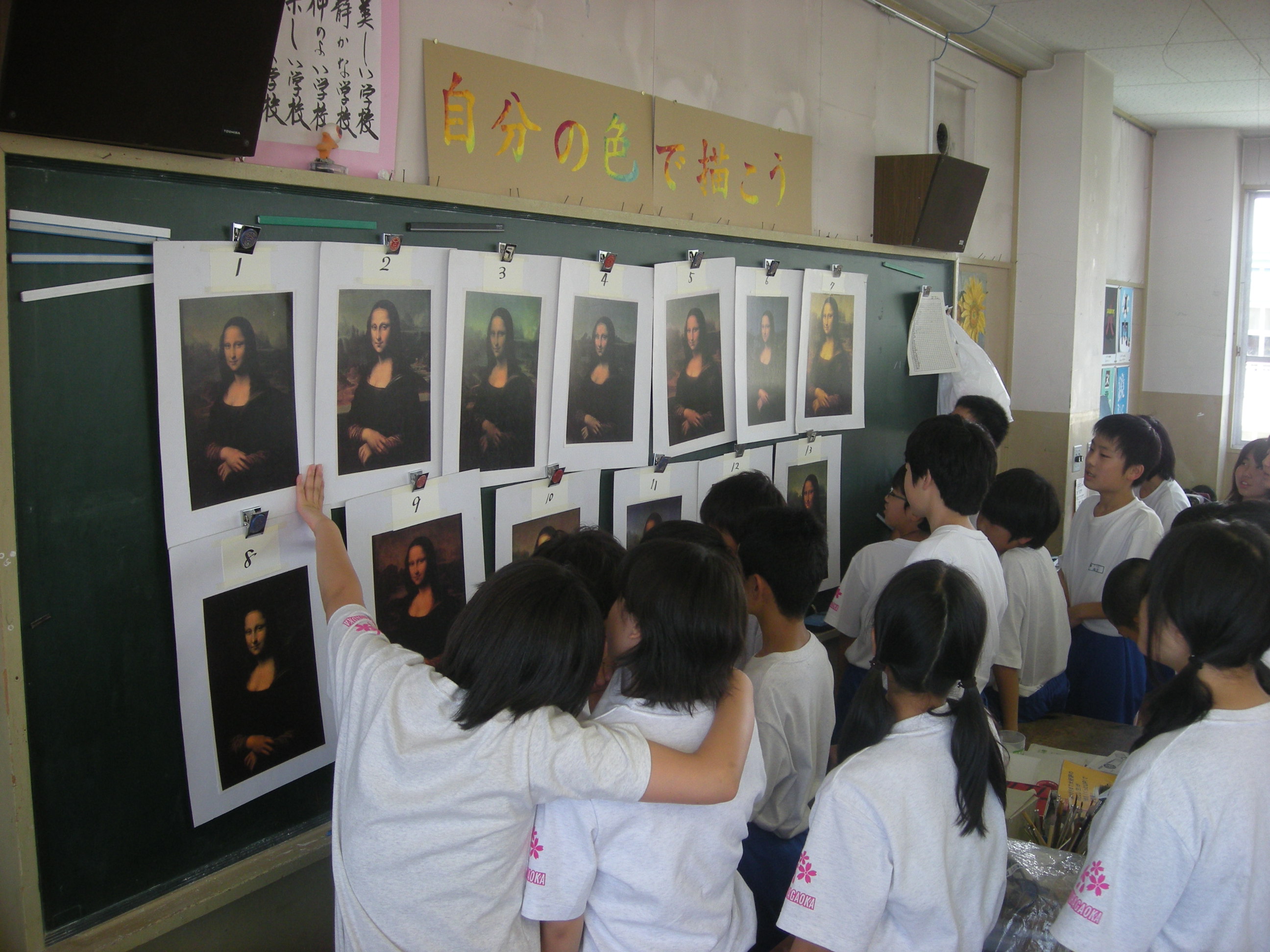 1年必修授業の「ルネサンス2009」。その中の小題材「モナリザでマネリザ」を行っています。13枚のモナリザの中から本物を一枚探しています。みんな目は真剣です。それぞれ、ちゃんと自分の考えに理由をもっています。「なんとなく」ではないところが素晴らしいのです。
