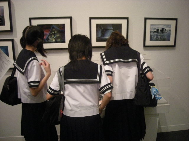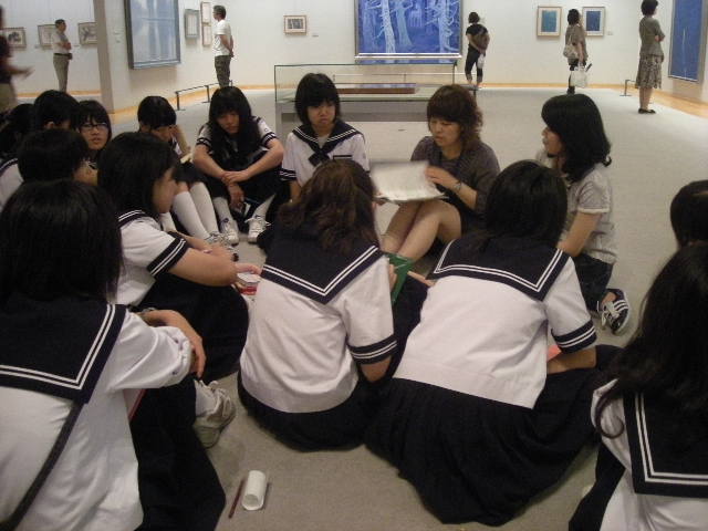 今回の美術館見学は、もう一つ目的があります。それは、8月29日「さくらびアートプロジェクト2009」で、美術部として「さくらなつかしプロジェクト」を展示するからです。先日のなつかし写生大会の絵を教室内に展示するにあったて、学芸員さんに、実際の美術館で作品展示の方法などをレクチャーしていただこうと考えました。事前に生徒たちには質問事項を出させていていました。「どう展示するとおもしろい展示ができますか」という質問に対しては「自分たちの作品が面白いと思っていますか?」と学芸員さんから問われ、うなずいている部員が多かったです。ライティングやキャプションといった必要な準備品に対しても新しい視点を得たように思います。