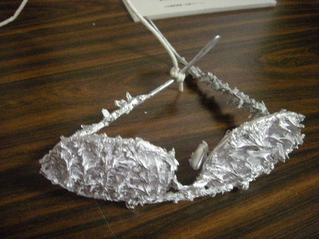 写真の作品は「痛いメガネ」。モデリングペーストでとげとげが万遍なく作られ、いかにも「つけたくない」と思わせる異様な風体です。しかも色がシルバーでかっこいいのですが、痛さを視覚からも感じます。目や顔で痛さを感じるという今までにない作品です。