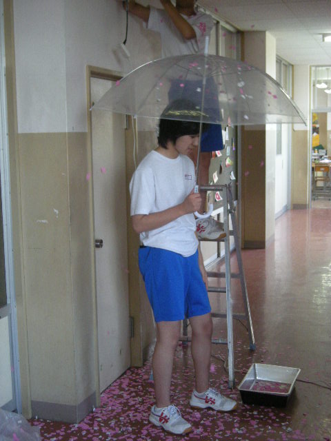 教室内に櫻吹雪!!こう考えたのは、本校科学部の男子生徒を中心にした塩川岳チーム。作家の塩川さんと一緒に、櫻吹雪実験。実際にやってみると、問題点が明確になります。何回も繰り返していました。