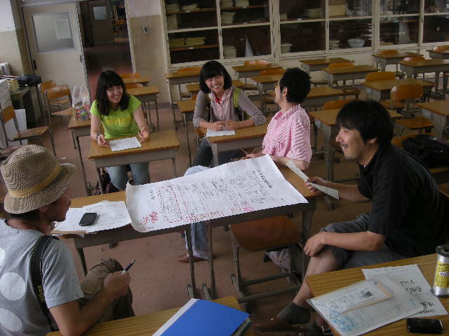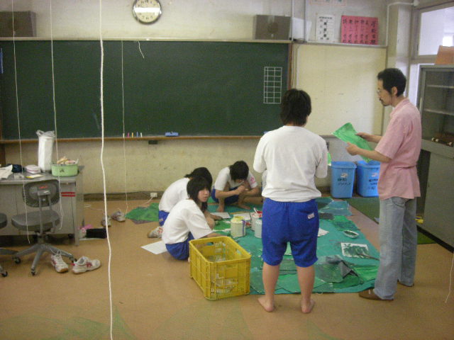 面談室で作業中の中村仁チーム。中村さんが買ってきて下さった大きな網を使い、教室内に大木が出現するようです。「教室が森」になるようです。