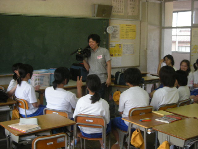 さて、昨年もながのアートプロジェクトに映像作品で協力してくださった住中浩史さん。今年は、2年1組の有志である女子12名で作品を作ります。「今までになく、今年はテンション高いですね」という住中さんの言葉通り、2年1組の女子はにぎやかです。一人一人自己紹介し、どんな映画がすきか、など発表していきました。最後の校舎や体育館を映像に残すという意味もあります。楽しみです。