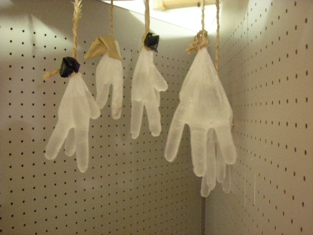 今日は、作品に触れてもらうため、作品以外の装置を工夫した作品「魔界の案内人」を紹介します。この作品は、上からぶら下がっている不思議な感触の手袋を、顔のほっぺたで感じるという作品です。