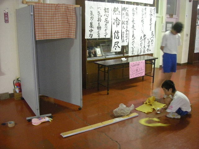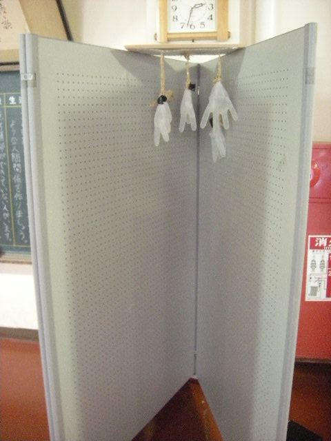 見る人の動きを誘導するという発想は、とても素晴らしいと思います。また、作者は、単なる衝立が置いてあっても、興味を持ってもらえないということに気づき、衝立の表面に「?」などという目立つ文字を布で貼り付けました。中学生の発想って、限界がなく、また大人も顔負けするぐらいですね。
