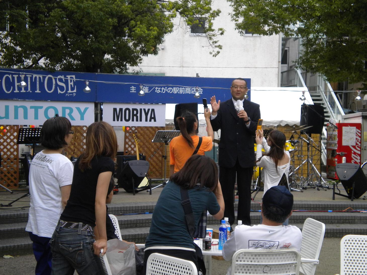 長野駅近くの公園では、翌々日に迫ったびんずる祭りのプレイベント準備中。一般の方々が何人かいらっしゃいました。お話してみると、3人の方が櫻ヶ岡中学校卒業生!でした。話が盛り上がり、最後はみんなで校歌を歌いました。