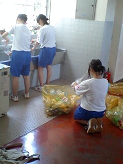 「太郎の海」という作品を二つの教室を使って表現する女子チーム。武蔵野美術大学の高貫さんんとコラボしています。今日は、コンビニへ行って、ペットボトルをもらってきました。お店では、さくらびの概要と作品の説明をし、なんとかペットボトルをいただけたようです。水道で水洗いする活動を汗をかいて行っていました。来週も登校するそうです。