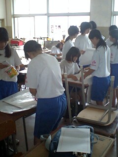 一方、美術部は、1、2年生を中心に「さくらなつかしプロジェクト」の準備に入りました。今日は、写生大会で描いた40枚以上の絵の作者名などをメモにし、絵を台紙に貼っていきました。ボンドを塗る人、台紙に貼る人、裏に名前を書く人、重ねて乾燥する人、など分業制でスムーズに行えました。こういった分業作業も大事ですね。2年生は一生懸命1年生に説明をしていました。