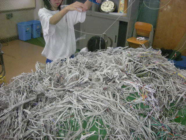 中村仁チームの女子3名は今日も登校。午前中一杯、シュレッダーで新聞紙を加工していました。今日は4台のシュレッダーを駆使し、昨日の二倍近く生産?していました。リズムに乗ってきましたね。