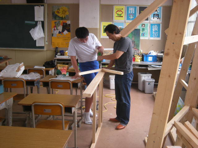 美術室では、「櫻中城」がどんどん築かれていました。建築家・縣さんと男子生徒が、木材を加工しています。ドリルを実際に使わせていただき、生徒の顔も晴れ晴れとしています。その進み方はすごいものがあります。
