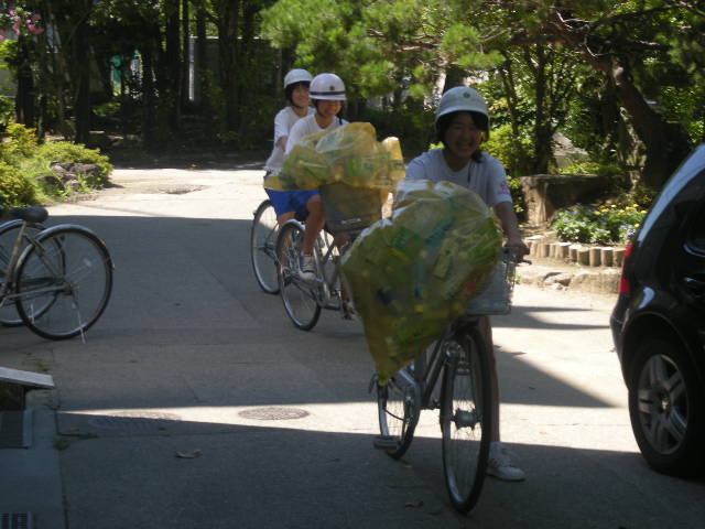 自転車部隊が学校の周りで活動していました。ペットボトルを調達しているようです。武蔵野美大学生の高貫さんとチームを組んでいる女子チームの作品は、「浦島太郎」がテーマ。水を使うためのペットボトルを集めています。それにしても、大量のペットボトルですね。しかも、みんな表情が明るい!これは期待できます。