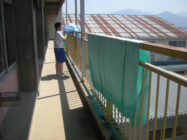 学校をアトラクションランドに変身させよう!!という野望を持つ男子グループは、改築される100番校舎のカーテンを集め、緑色に染め始めました。始めは緑色だけかと思っていましたが、黄色や青、なども染めています。「緑だけじゃおもしろくないんで」と、美術っぽさが出てきました。