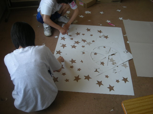 いつも、地道な活動を続ける、太田チームの女子グループ。教室内をカラースプレーの文字で埋め尽くし、記念写真を撮ってもらおうという作品。細かい切り抜き、根気がいりますが、少しずつ進んでいますね。