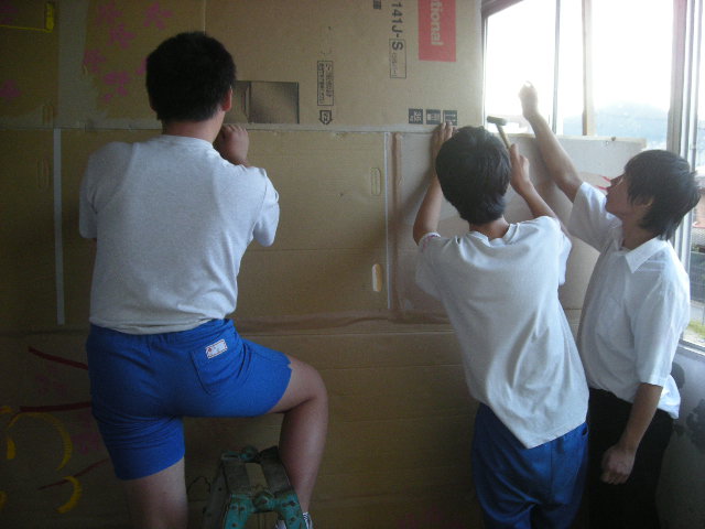 「今日は学校に泊まりたい。ここで一夜を過ごす準備をしてきた」。冗談なのか本気なのか、3年生が制作中にそんなことを言いました。他の男子も「俺もそうだ」と言っています。「家に帰っても、勉強のことばかりで・・・。ここにいたいなあ」と言います。数日前は、この現場に来てもおしゃべりばっかりで何もしなかった生徒が、こんなに変わるなんて驚きです。