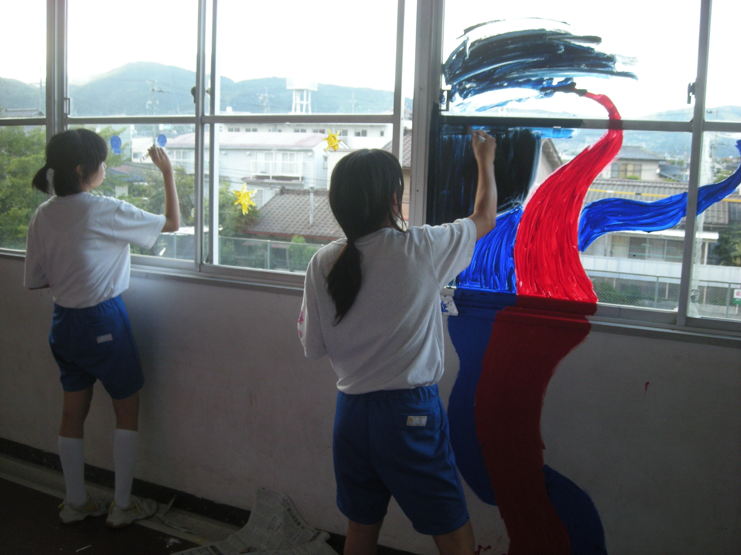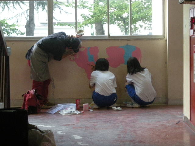 2階の廊下では、美術部員が壁や床、ガラスに絵を描きまくっています。絵が巨大化してきて、広がってきています。広がっているのは、絵だけではありません。数日前より描いている部員の人数が増えています。3人が5人になり、今日は8人で描いていました。そして、絵が大きくなってきています。こういったプロジェクトの良さは、他の作品や制作者の影響を受けやすいということ。単に絵を一人で描いていても気づかなかったことに気づいているのかもしれません。