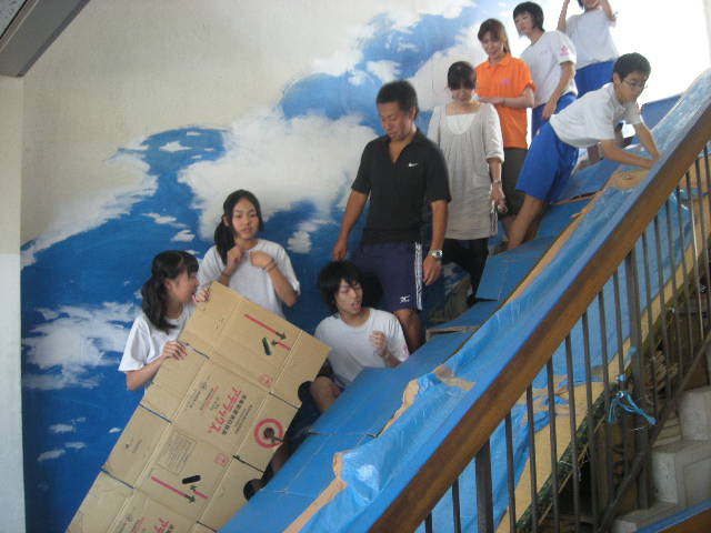 今回もっともダイナミックなアイデアで度肝を抜いた「オウチューランド」。1階から3階までの階段を滑り台にしました。すべり台つくりに当日朝も作り続けた大作。子どもが喜んで滑っていましたが、あまりに急斜面のため大人は躊躇する人が多かったそうです。青い滑り台を白い雲を模したダンボールで滑ります!!