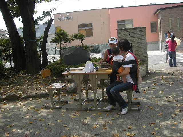 「おもてなし」というキーワードで、美術部は、写生大会を行うなど取り組んできました。先日、ある空き教室から古い学校行事の写真が発見されました。そのアルバムをお客さんに見ていただき、お茶などでおもてなしをしようと考えたのが、「オープンカフェ」です。昇降口の櫻の木陰で、くつろいでいただきました。この場所は校舎の全てが見渡せ、学校名も見ることができます。