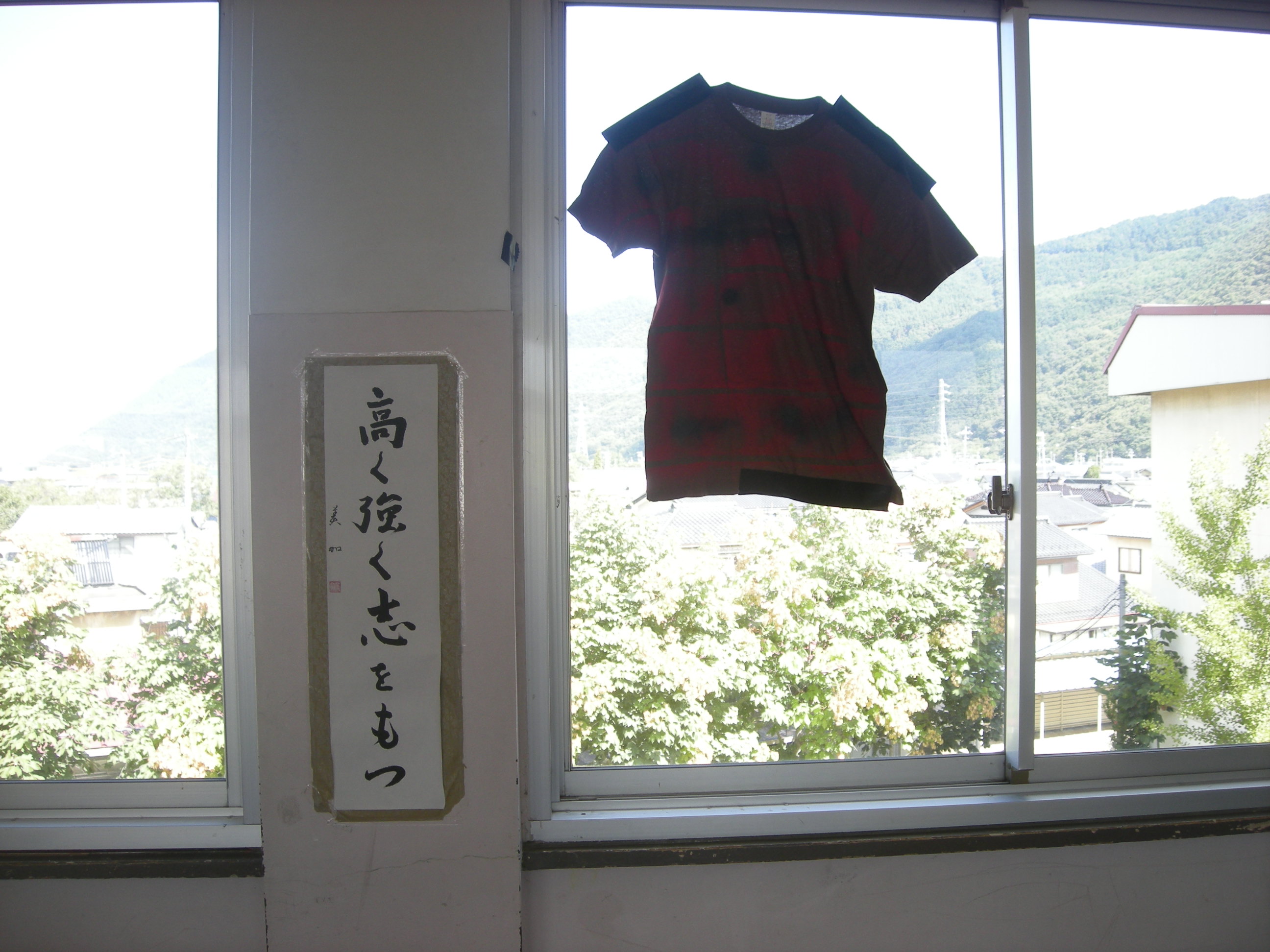 今回の「とがび」で私が注目した写真の作品「透明人間」。Tシャツにいろいろな文字や模様が描かれ、教室内に無造作に並べられています。ガラスやロッカーの上に置かれている様は、脱いだまんまの状態?ほったらかしにされた状態、などいろいろな情景が浮かんできます。3年生の作者は教室という空間で、Tシャツに今の自分を重ね合わせて何かを伝えようとしています。