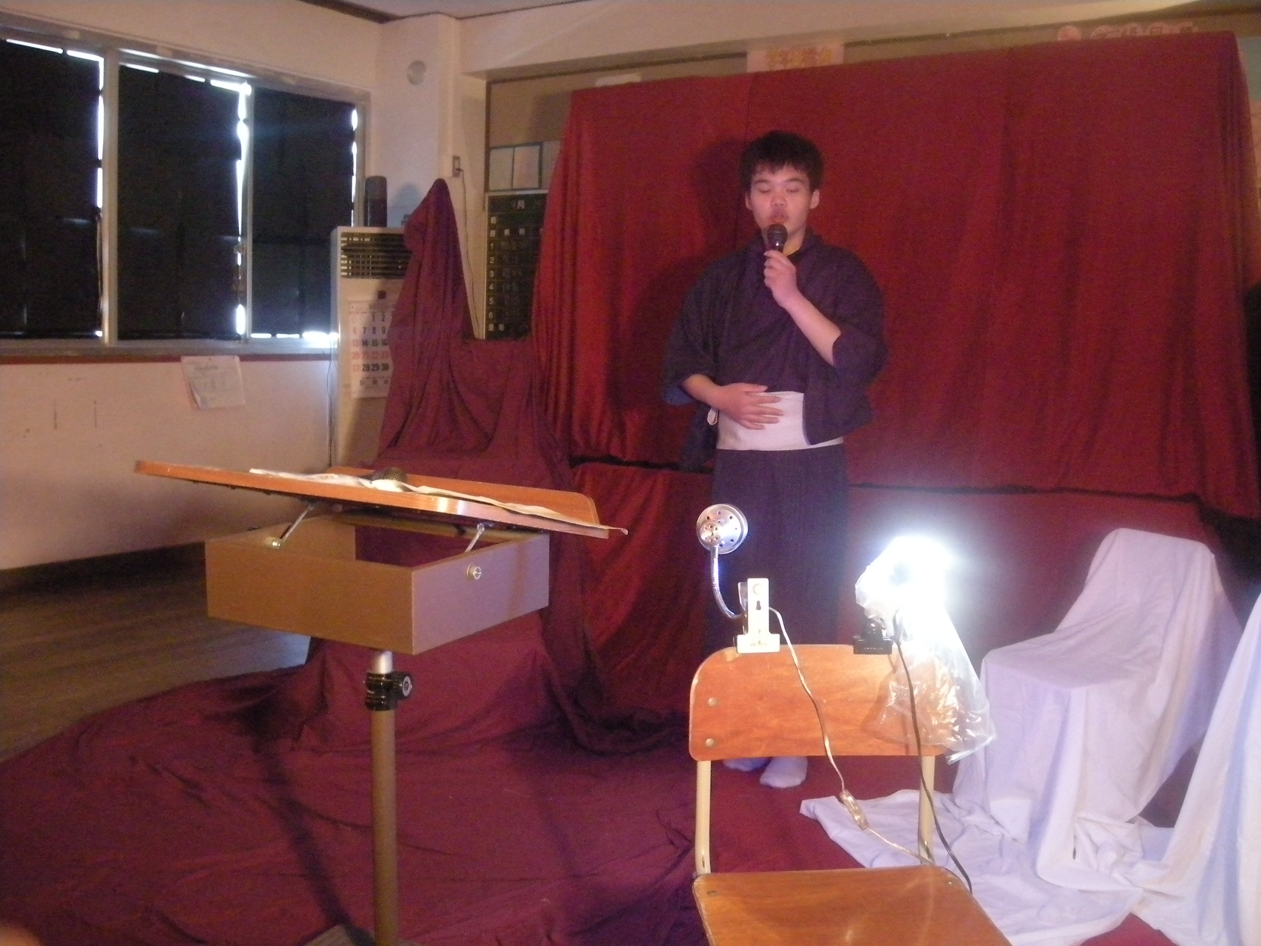 写真は、とがび2009の「桃蓮華鏡」という男子中学生の完全自己プロデュース・リサイタルです。会場つくりから、演出、歌唱全て自分で行う徹底振りは、「本気」を感じさせます。中学生の本気は、大人も感動させ、大人をも本気にさせるのです。中学生の本気は、今どこにあるのでしょうか。学校の部活動でしょうか。部活動の人気が下降気味である今、桃蓮華鏡は、なぜ選択音楽ではなく、選択美術を選んだのでしょうか。桃蓮華鏡や「透明人間」という作品からは、本気が感じられるのです。本気だからこそ、もしかすると、表面的な美しさよりは、生々しさや、暴力的な感じを受けるかもしれません。しかし、それが中学生の表現なのです。表面的な技法は乏しいのです。