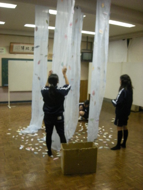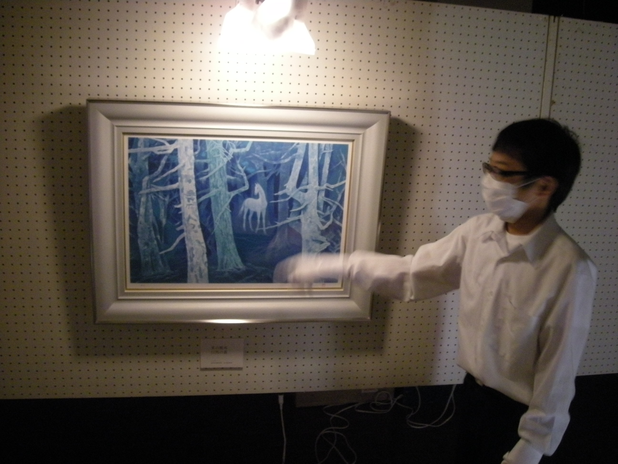 Nプロジェクト実行委員会代表の中平です。とがび恒例の東山魁夷展!と思いきや、なにやらいつもと様子が違います。展示会場の中央に、薄水色の布の塔が。光でライトアップされて、落ち着く雰囲気です。秀逸なのは、天井の布をとめたガムテープを、落ち葉の形の色紙で重ね貼りし、見えないようにしています。その配慮がいいなあと思いました。演出と絵画、両方楽しめ、イメージを膨らますことができました。
